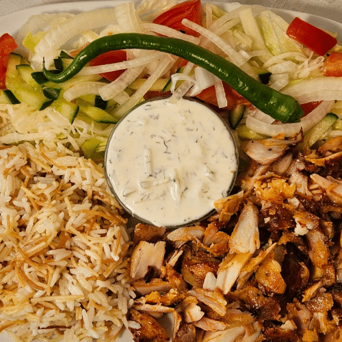 mit Hähnchenfleisch-Drehspieß, Salat und einer Beilage nach Wahl, ohne eine Sauce nach Wahl