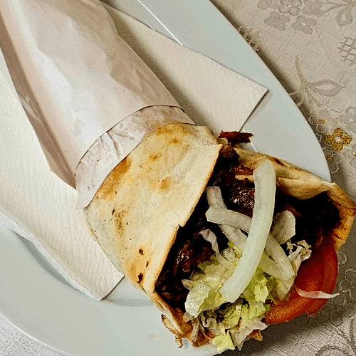 Tortilla Brot mit Kalbfleisch-Drehspieß und Salat (100 prozent steack fleisch aus kalb)